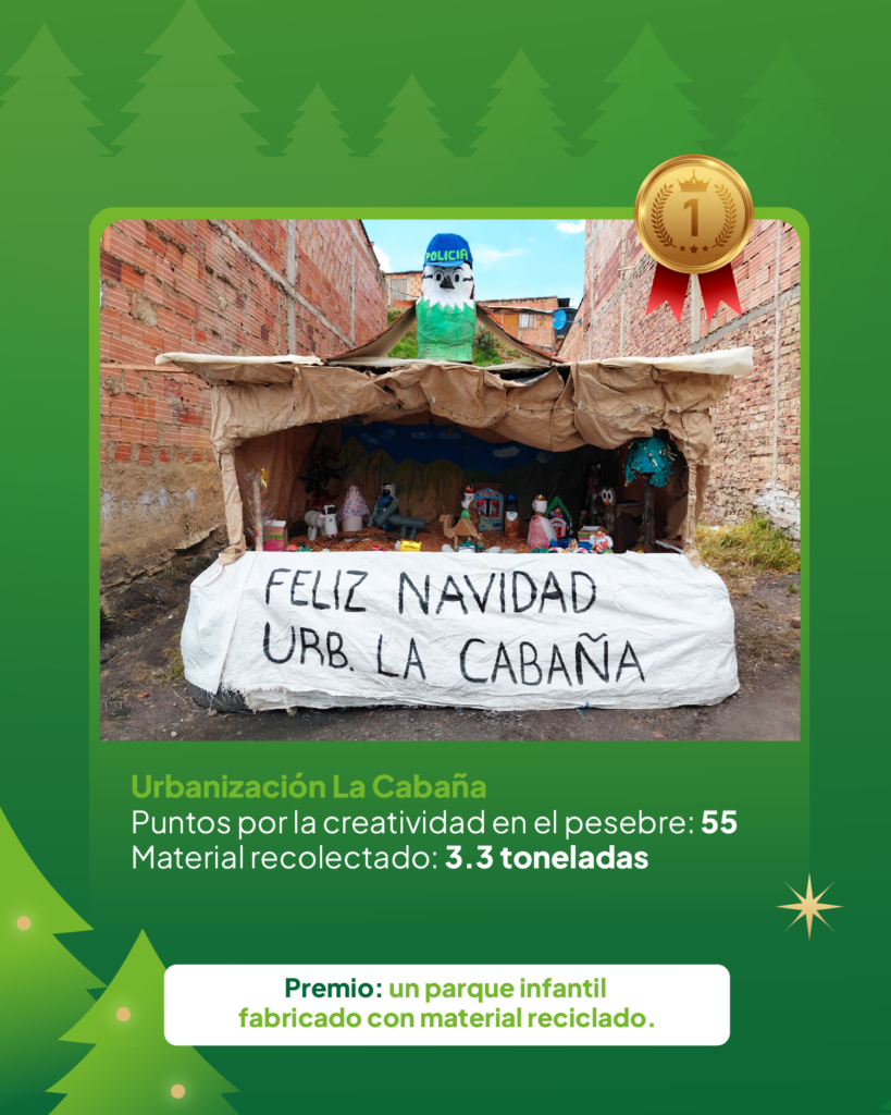 - Pesebre ecológico (50 %): creatividad, mensaje ambiental y uso responsable de materiales reciclables.